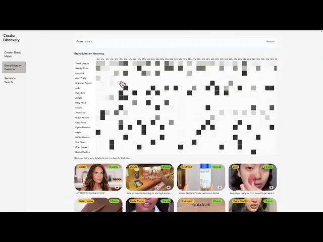 Brand Mention Detection: This feature focuses on visualizing brand mentions in Creator videos. The system fetches Creator videos from Twelve Labs and checks for existing user metadata containing brand mention events. When metadata is absent, it automatically triggers the Analyze API🔗 to generate brand mention data, then updates the video and renders the results as interactive heatmaps showing brand exposure patterns over time.