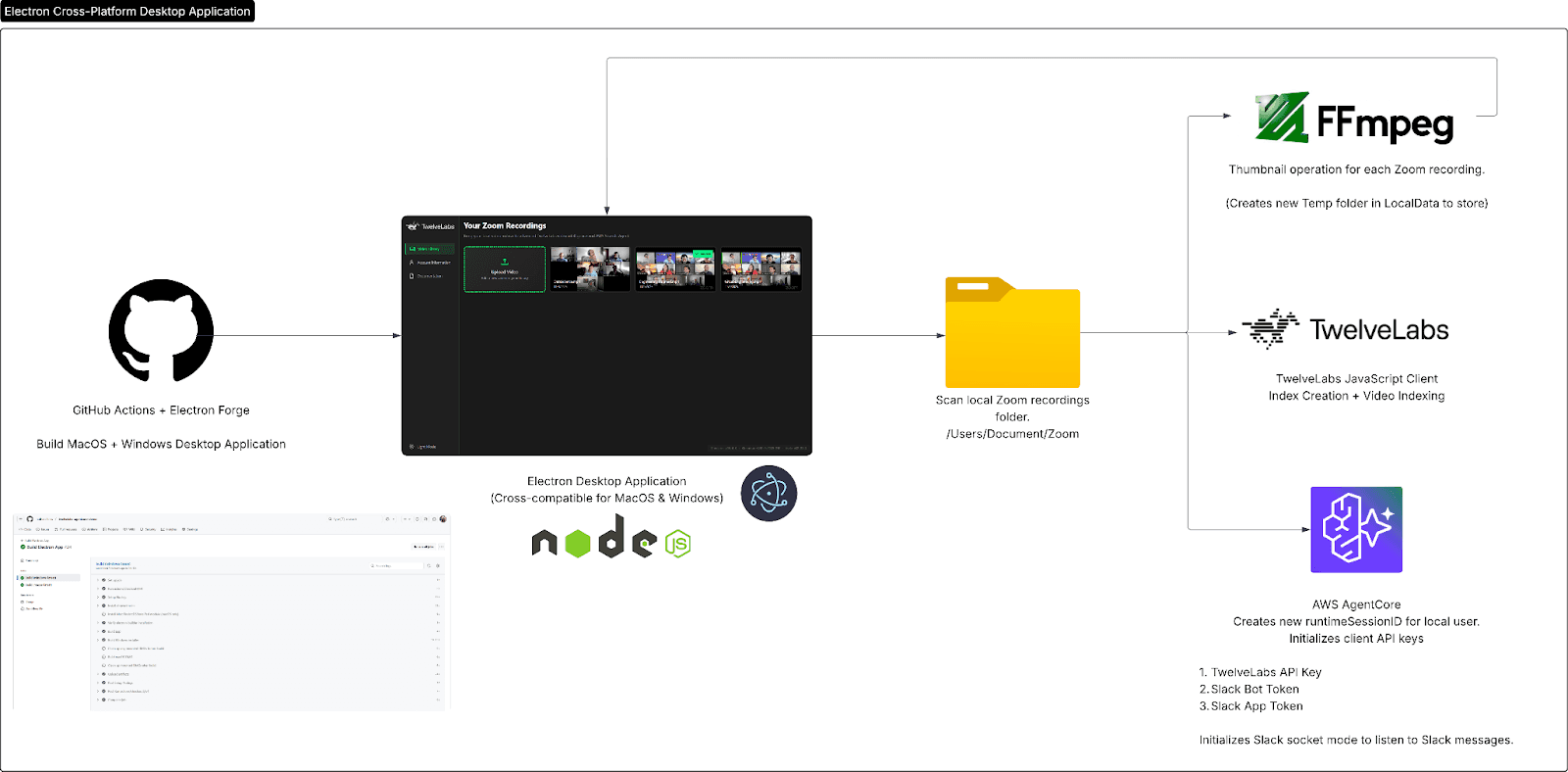 Above is the official technical architecture, which shows exactly where this desktop application slots into the rest of the software. To keep it short, we use GitHub Actions as a CI/CD pipeline to build for both MacOS and Windows (which you can download from the releases here) and use FFmpeg and NodeJS to handle preprocessing of videos. Finally NodeJS directly calls the API endpoint hosted from AWS AgentCore to access our AI Agent.