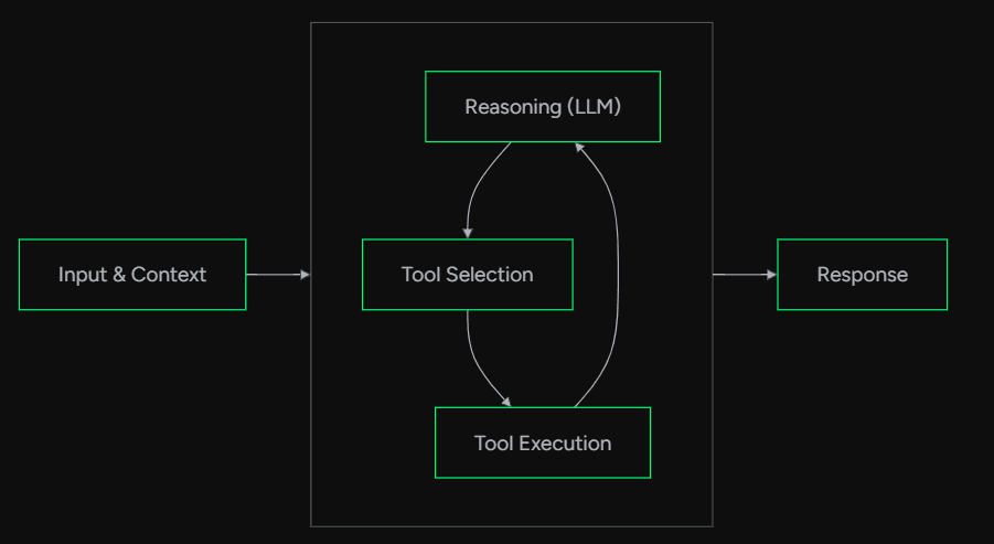 In the figure above, we see that there is an additional box in the middle containing tool execution, tool selection, and reasoning (LLM). Each of these steps all serve a vital purpose:
