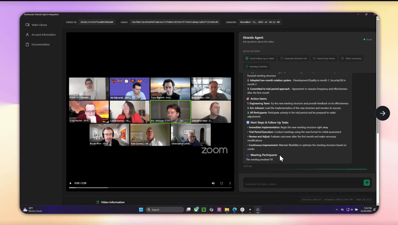 Thanks to the latest integration of TwelveLabs into AWS Strands Agent this is no longer a dream, in fact in today’s tutorial we are going to build this exact feature using AWS AgentCore, TwelveLabs, and ElectronJS.