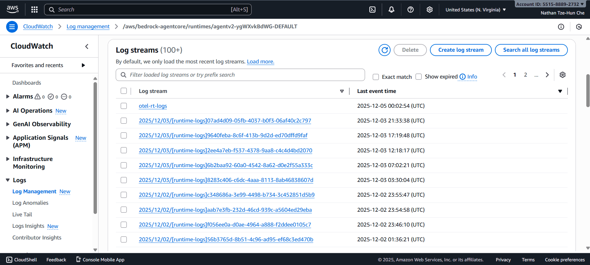 Alongside the AgentCore dashboard, CloudWatch logs give code-level errors and reports on each individual chat session ever had with the AI agent in production. This again provides invaluable insight as to how to debug.