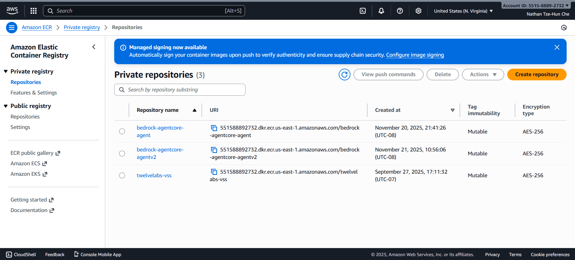 Depending on the name provided during launch, it will be assigned a unique repository URI and viewable within your ECR dashboard.