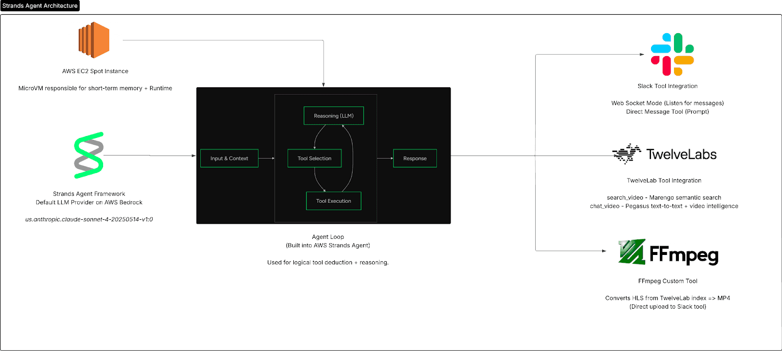 As you can see from the technical architecture above, Strands Agent serves as the foundational entry point for our AI agent, the agent loop then decides on tools, and in our case has the option to decide between 3 tools: Slack, TwelveLabs, or FFmpeg for video preprocessing.