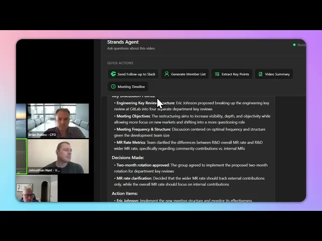 In this tutorial, you will learn about TwelveLab’s latest integration into Strands Agent, an AWS-native AI agent building platform that helps developers bring agents to production in seconds. Not only will you learn key technical concepts, but you will apply them by building and deploying an AI agent in AWS Agentcore that directly interacts with tools from Slack, TwelveLabs, and the Windows/Mac operating system.