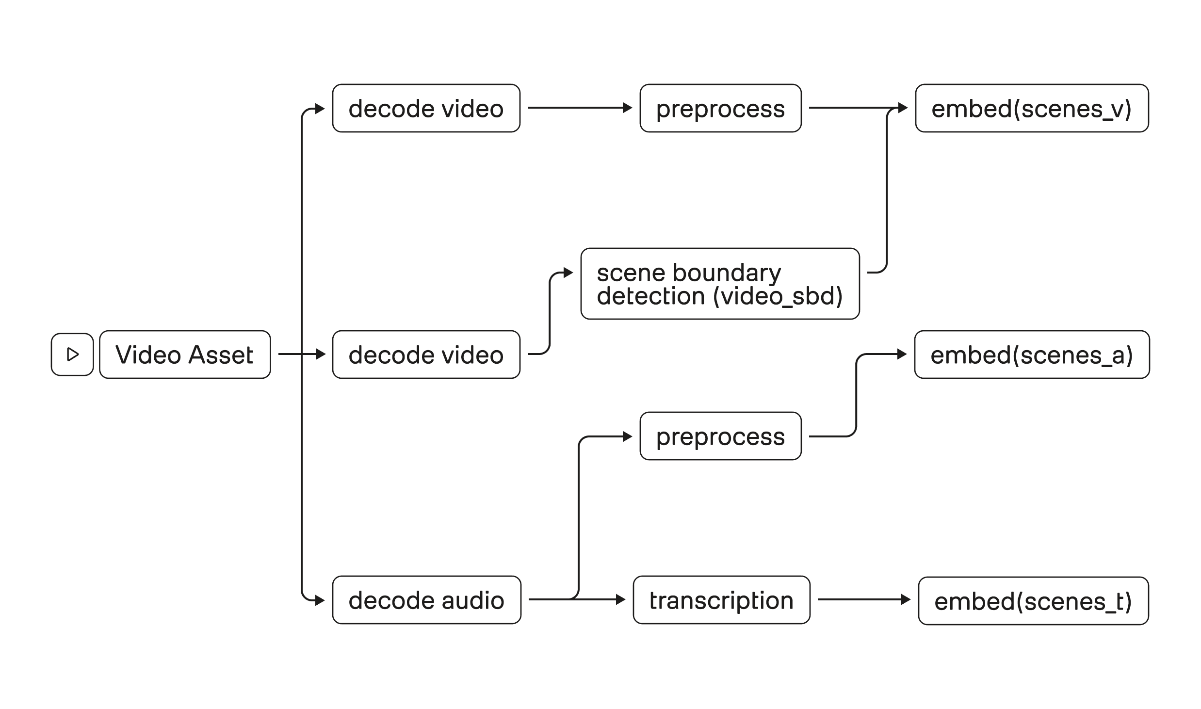 Figure 1. High-level embedding flow: decode video/audio, detect scene boundaries, then embed visual, audio, and transcript segments.