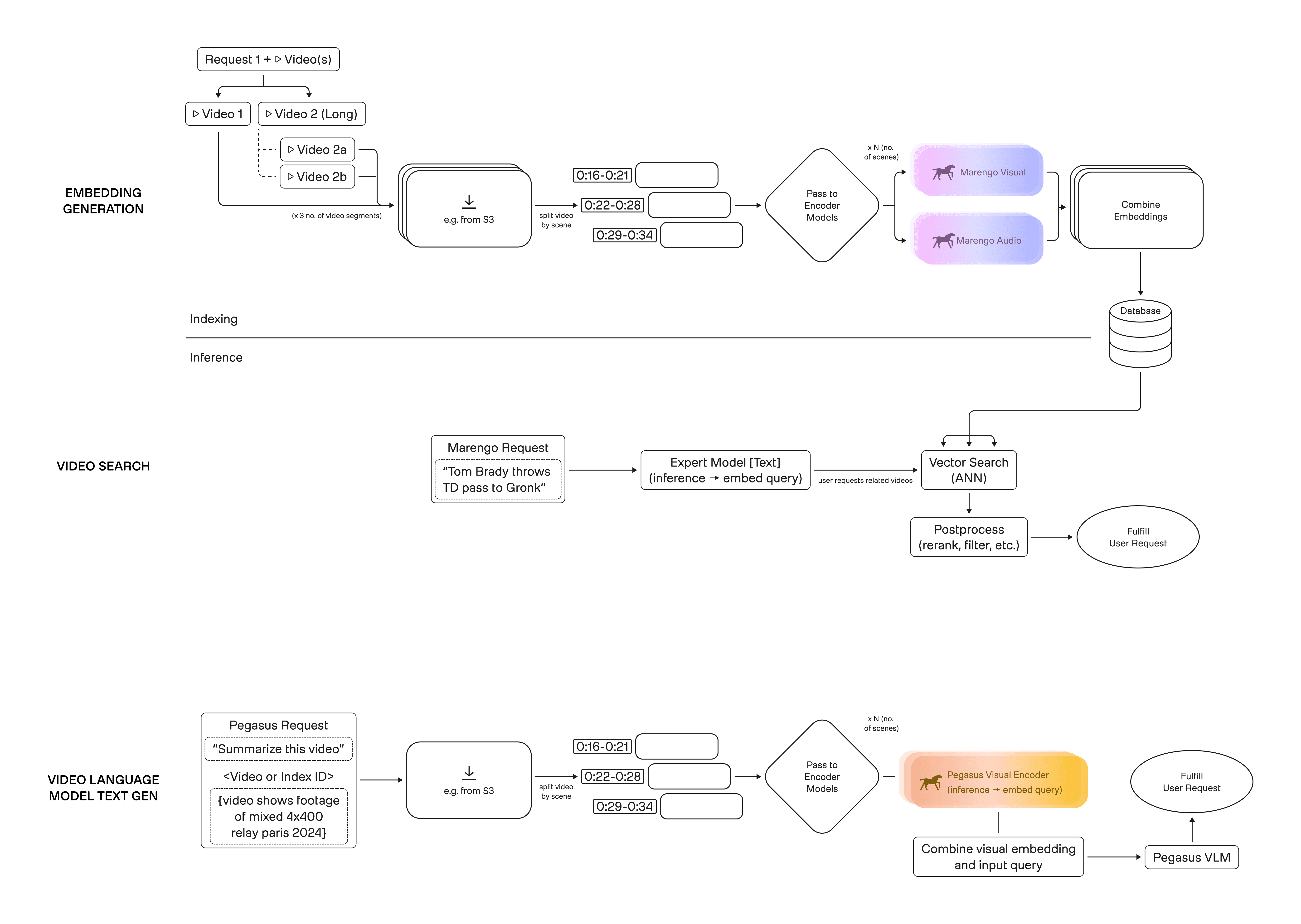 Figure 3. Three primitives powered by the same index: embedding generation → storage, text-to-video search via vector retrieval, and video-language generation via cached embeddings.