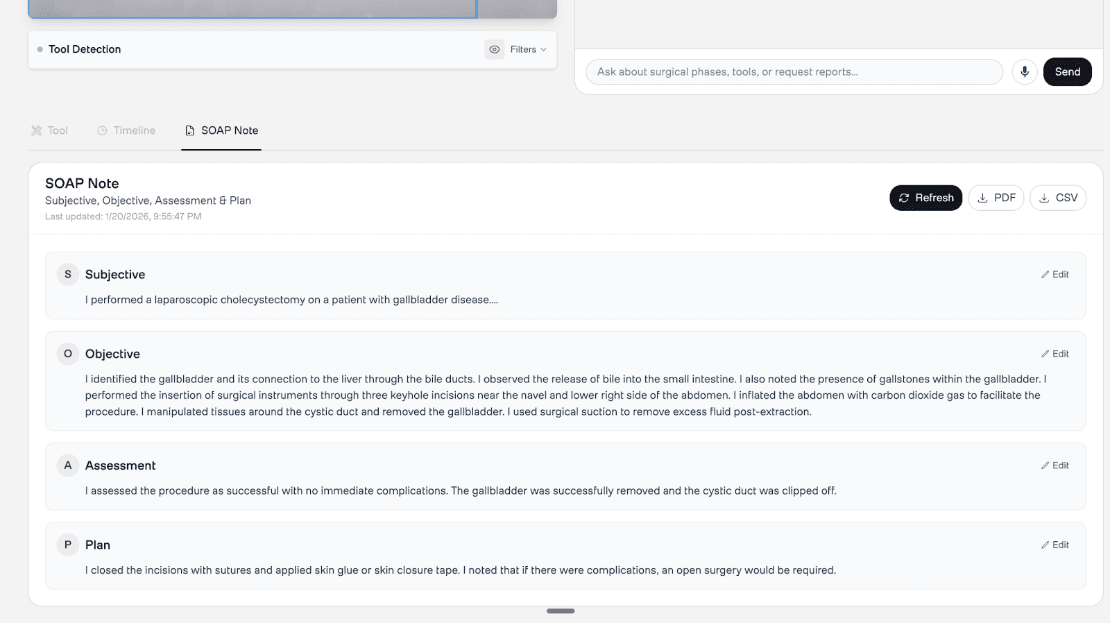 Generates SOAP operative notes (Subjective, Objective, Assessment, Plan) from video evidence