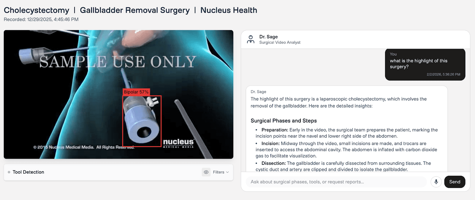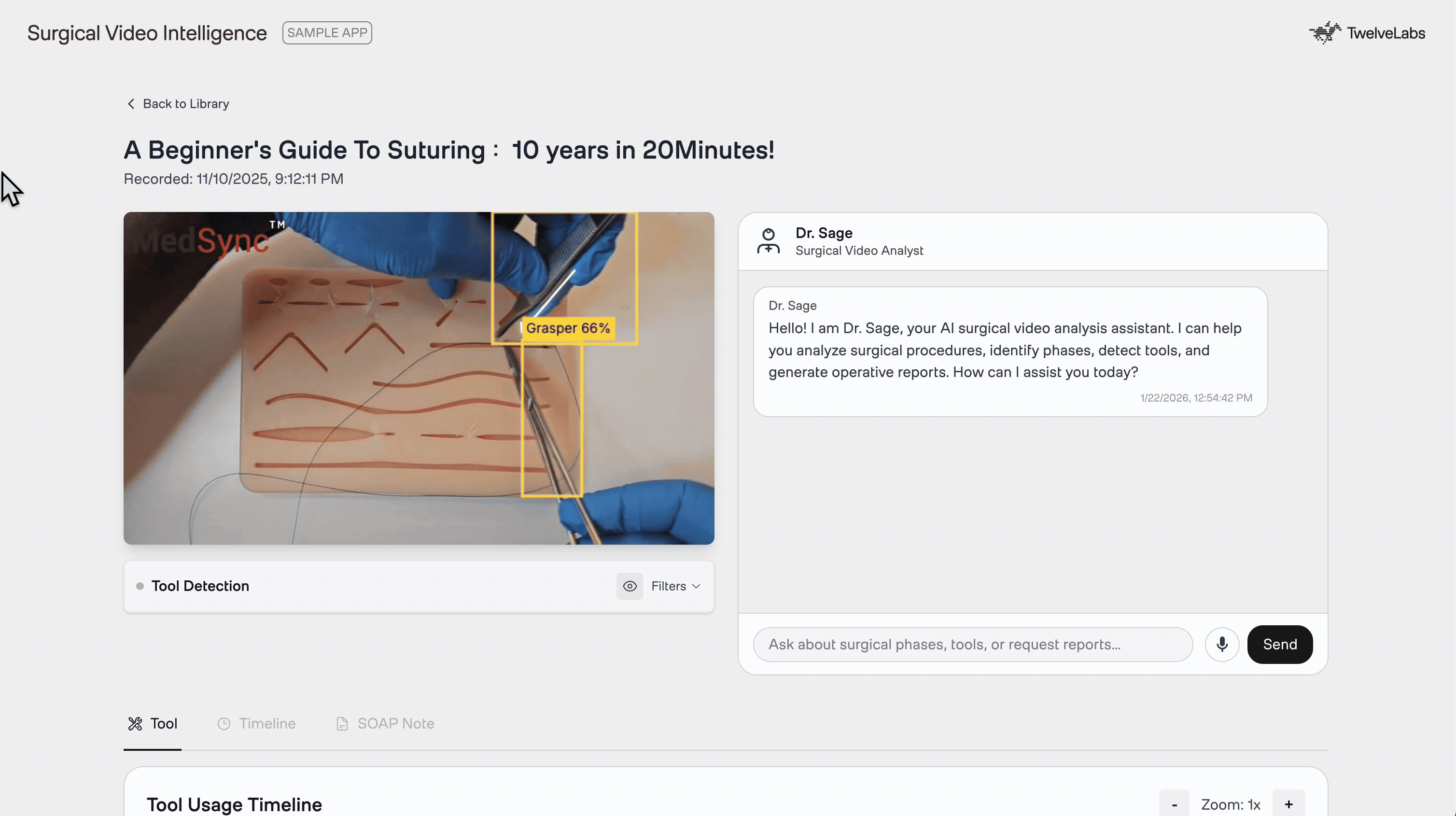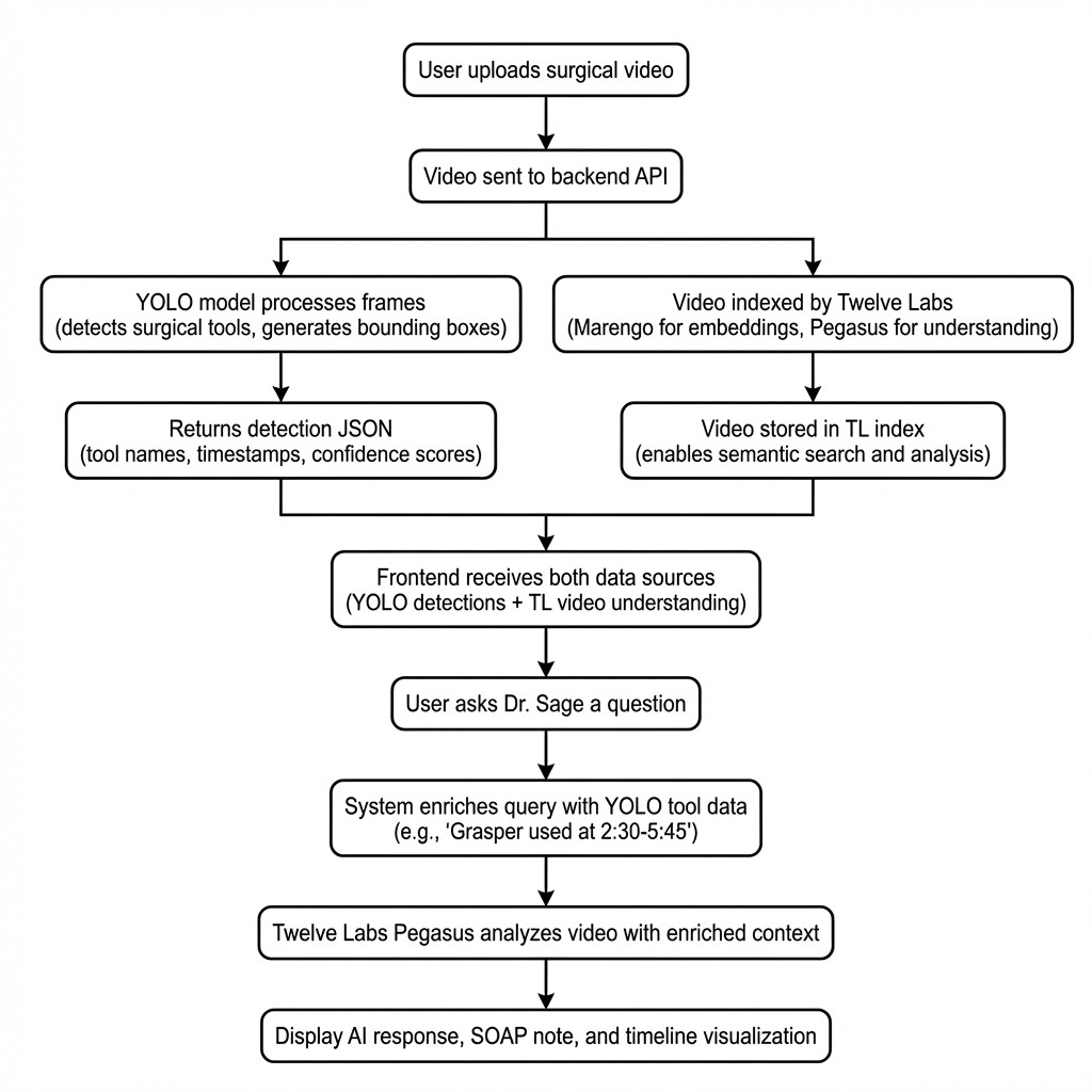 After automated analysis completes, Dr. Sage provides a conversational interface for follow-up questions. It has access to both YOLO detections and Twelve Labs video understanding, enabling queries like "What tools were used during dissection?" or "Explain the technique used at 3:45." This bridges the gap between automated reports and the ad-hoc questions that arise during surgical review and training sessions.