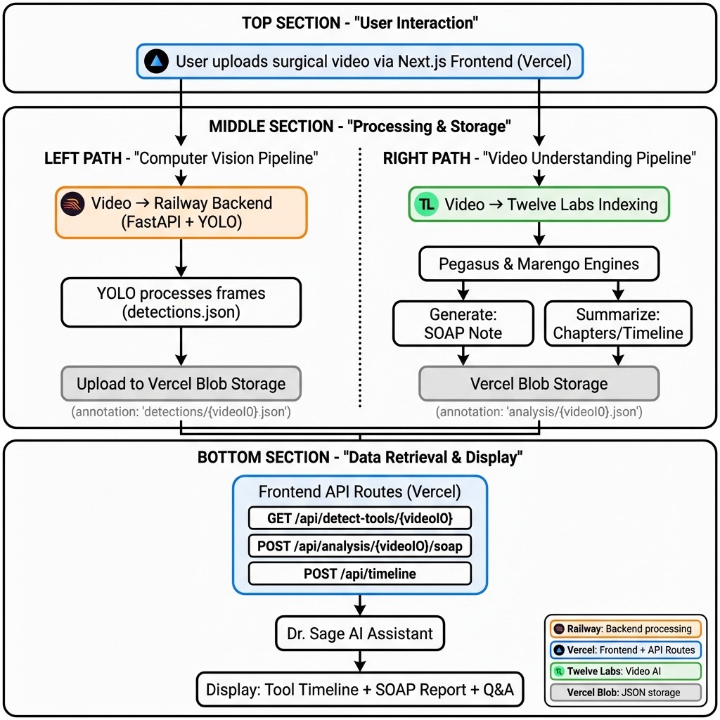 GET /api/detect-tools/{videoId}: Retrieves YOLO detections from Vercel BlobPOST /api/analysis/{videoId}/soap: Generates SOAP notes using Twelve Labs Analyze APIPOST /api/timeline: Creates chapter segmentation using Twelve Labs Analyze API