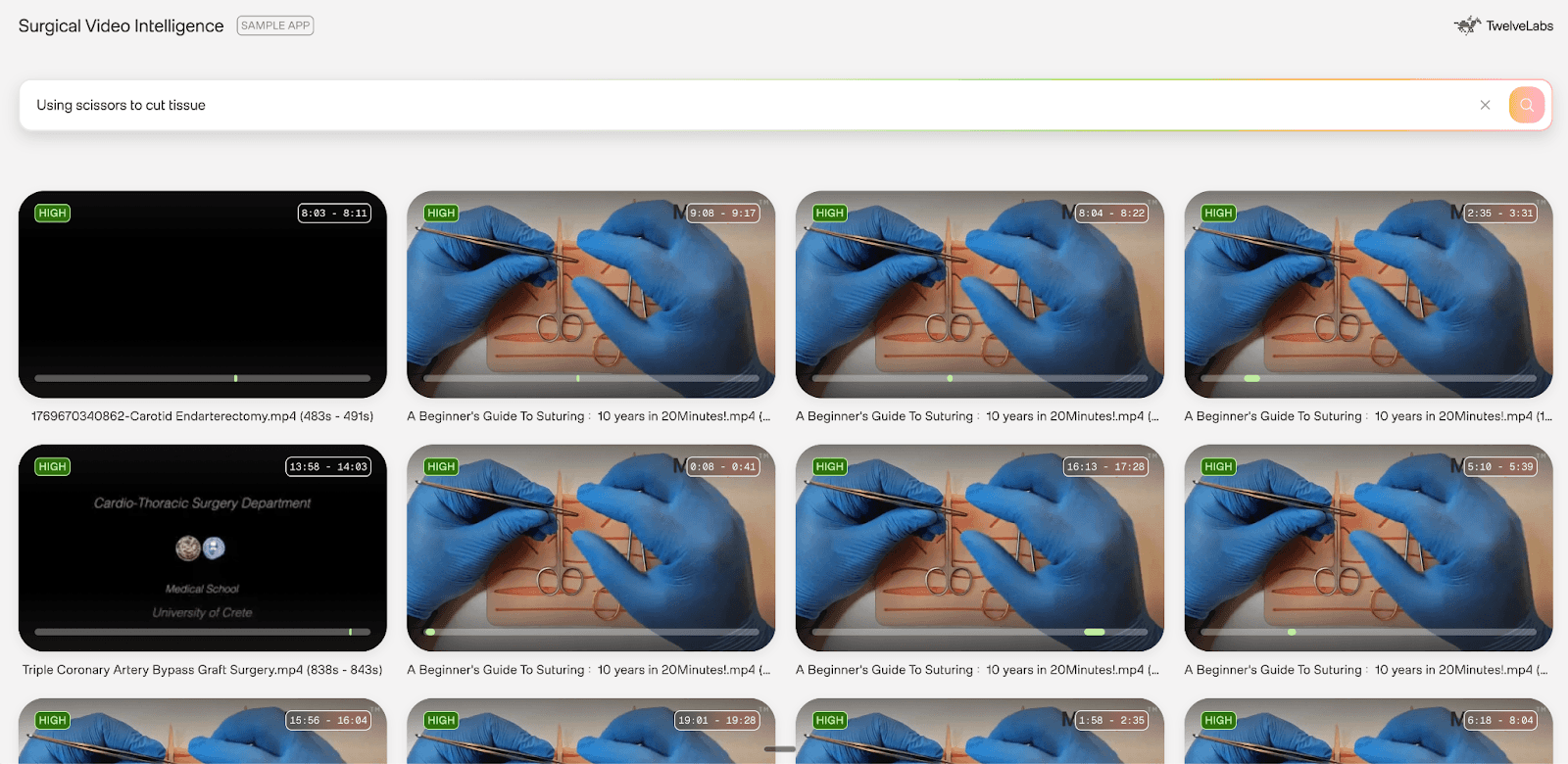 Why this works: Unlike keyword matching, Marengo understands surgical context. A search for "clipping of cystic artery" returns results even when no one says those exact words — the model recognizes the visual and procedural pattern. This enables building searchable surgical video archives without manual tagging.