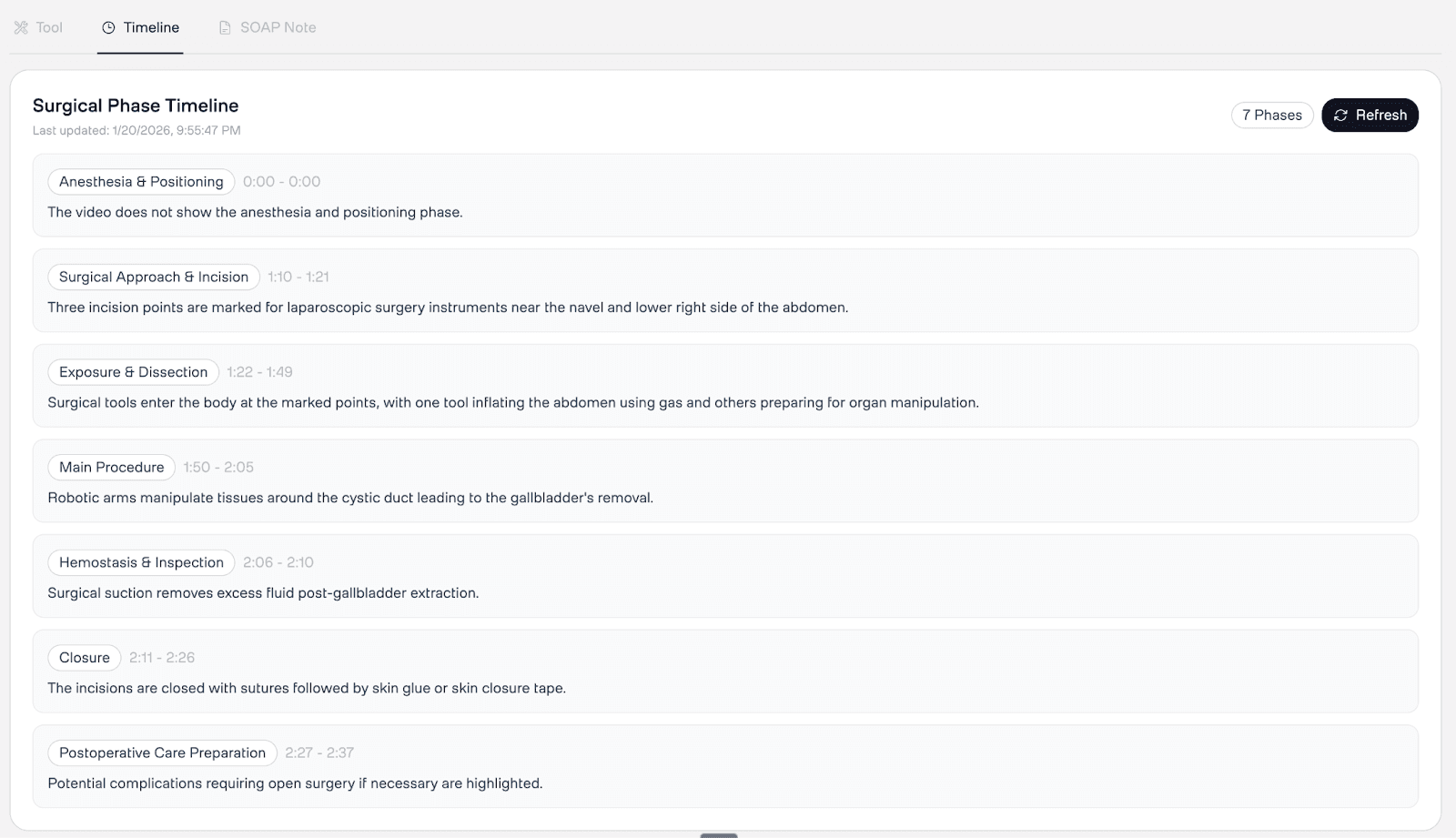 A surgical educator reviewing a trainee's cholecystectomy can instantly spot patterns — prolonged cautery before adequate dissection, or unusual instrument sequencing — and click any moment to verify in the video. The frontend maps the JSON detections array to CSS-positioned elements on the timeline bar.