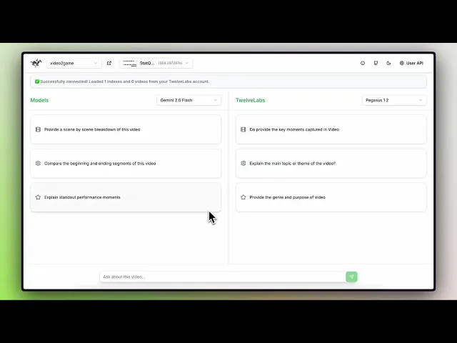 Below is a demo showing how different models are selected and used for the video analysis to compare their responses with Pegasus-1.2 (TwelveLabs). This setup helps analyze videos across various scenario understanding.
