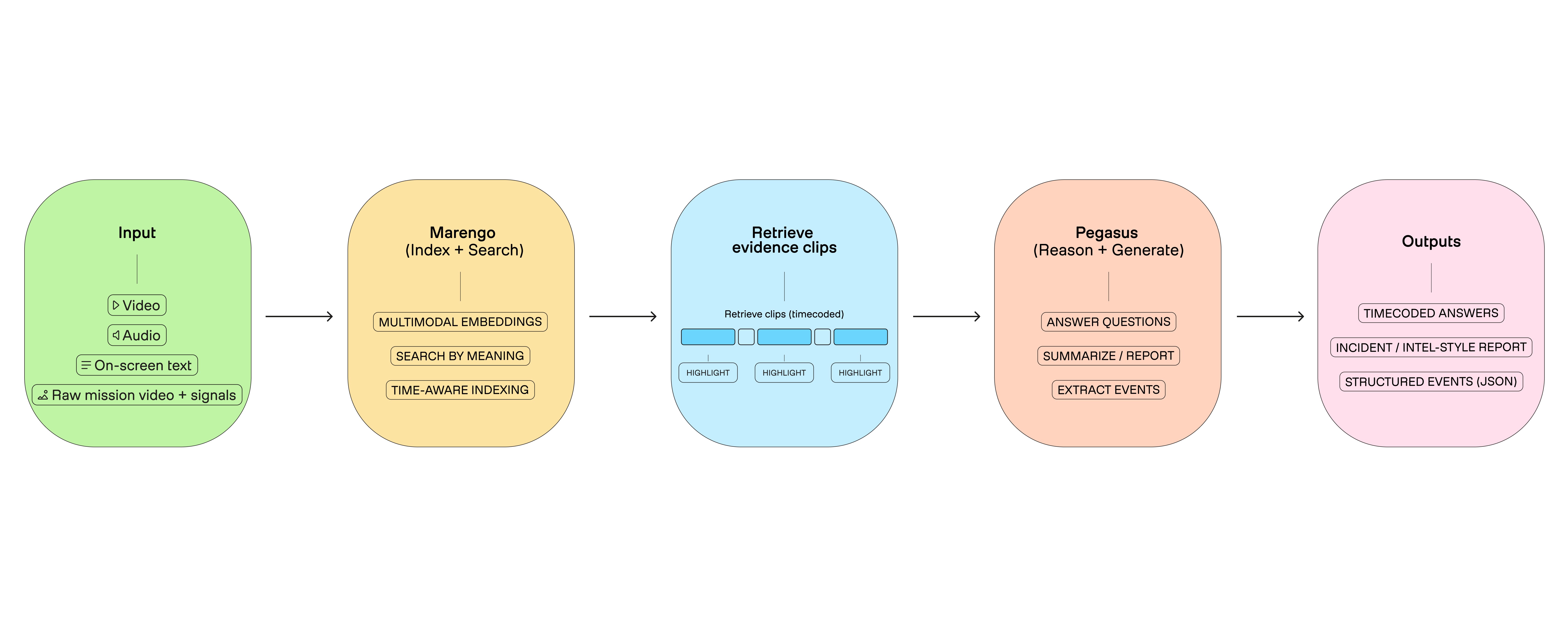 Figure 3: Marengo = video indexing + retrieval, Pegasus = reasoning + outputs.