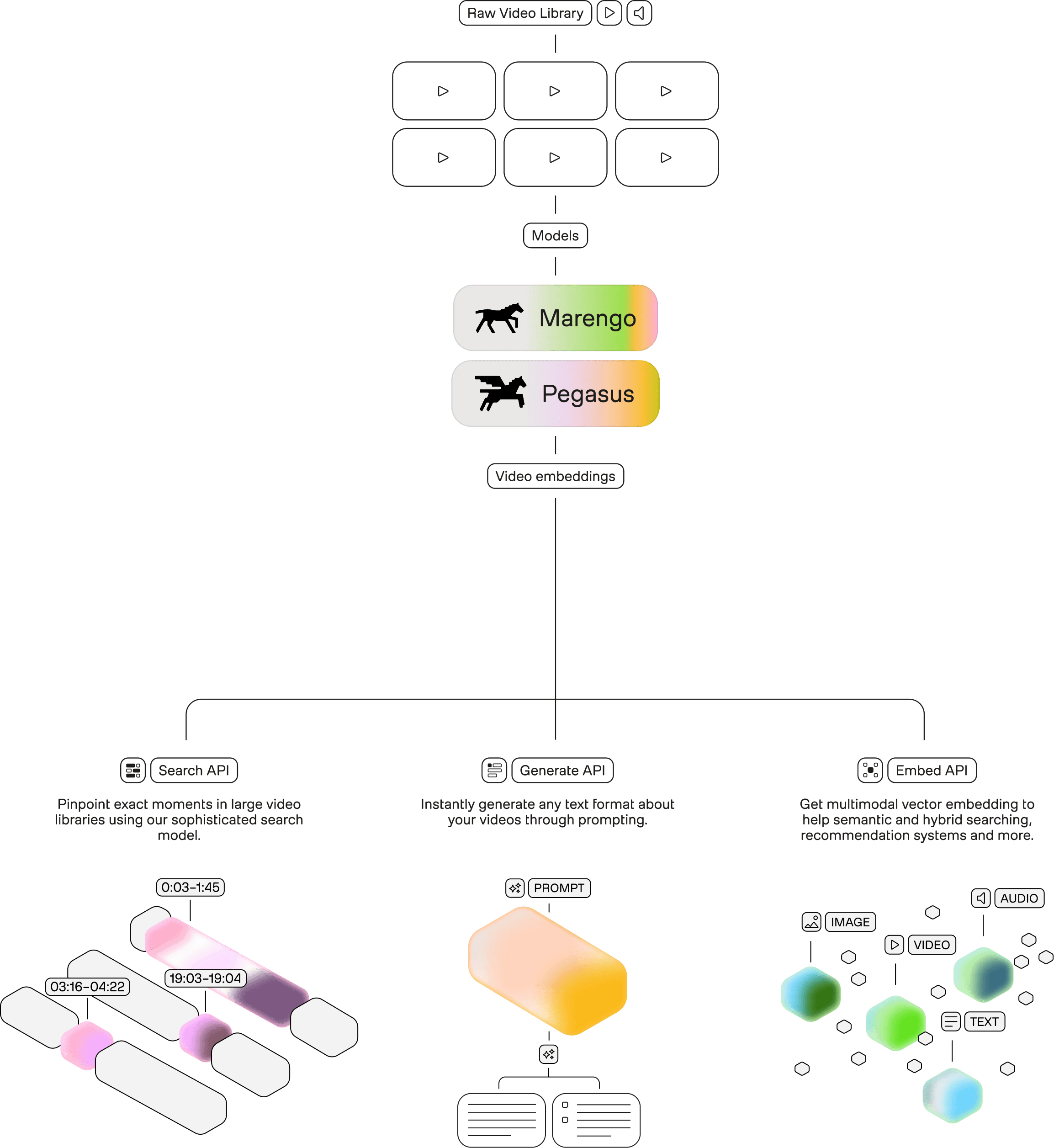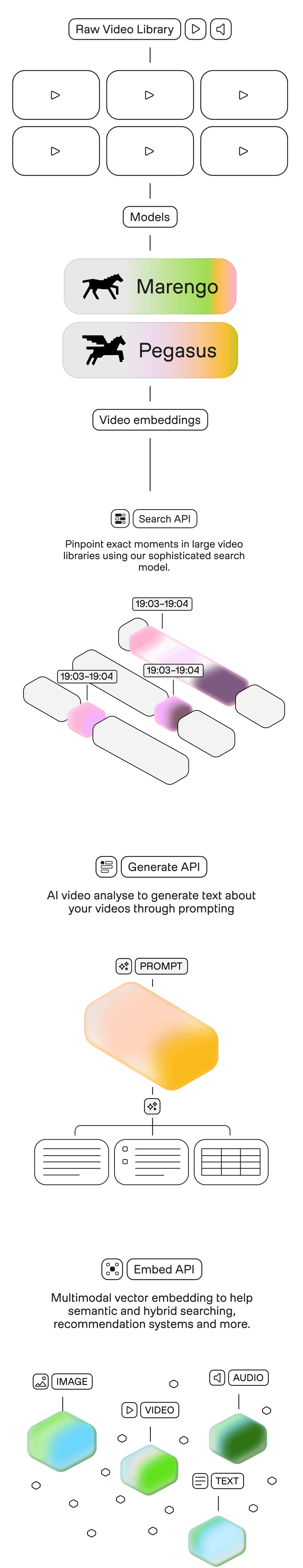 Our AI brings together temporal and spatial reasoning. It’s a unique interaction between our powerful encoder model (Marengo) and native video-language model (Pegasus) – and opens up whole new ways to use video.