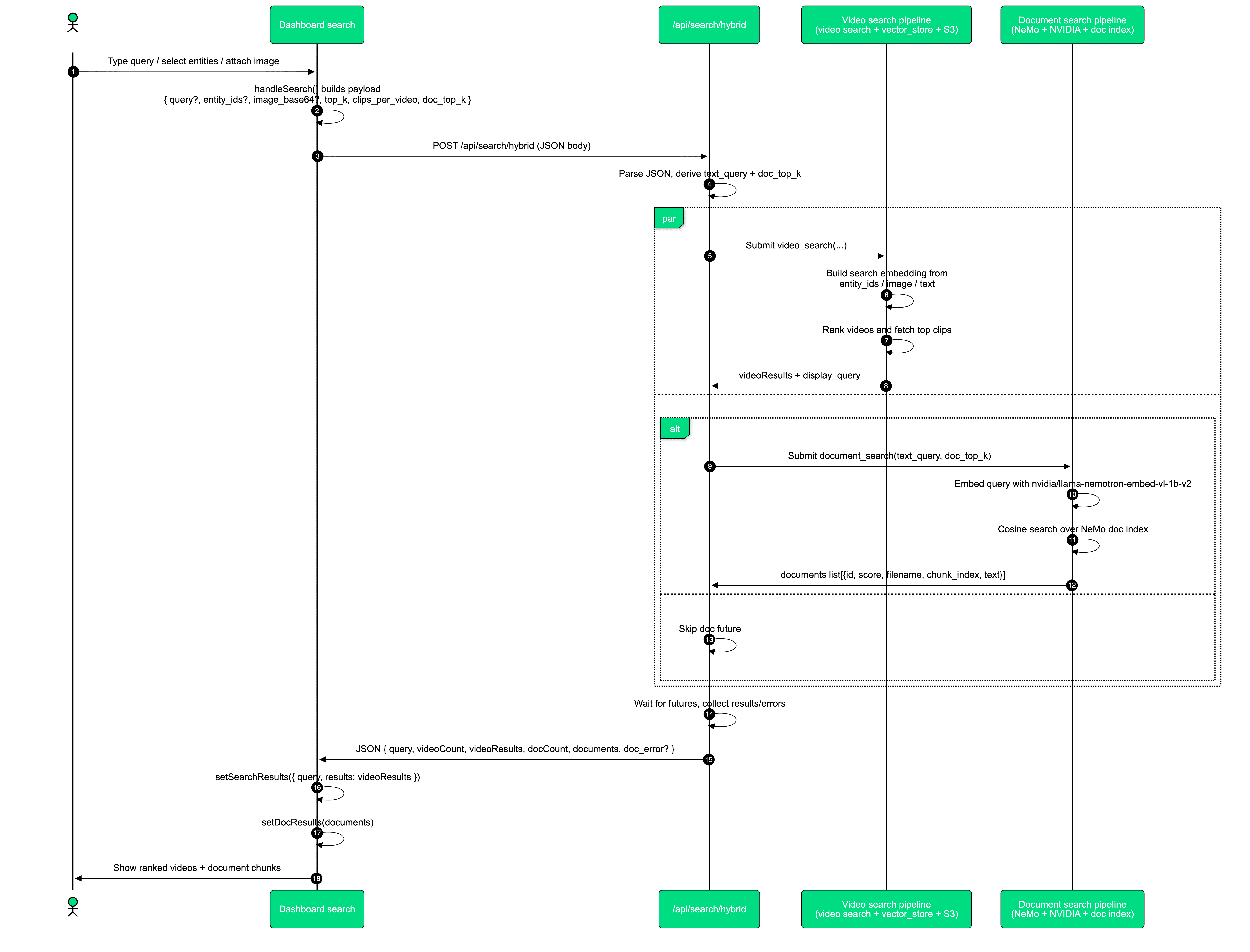 Parallel execution pattern: The hybrid search handler starts video and document searches simultaneously using threading, then merges results once both complete. This keeps total latency close to the slower of the two searches rather than their sum.