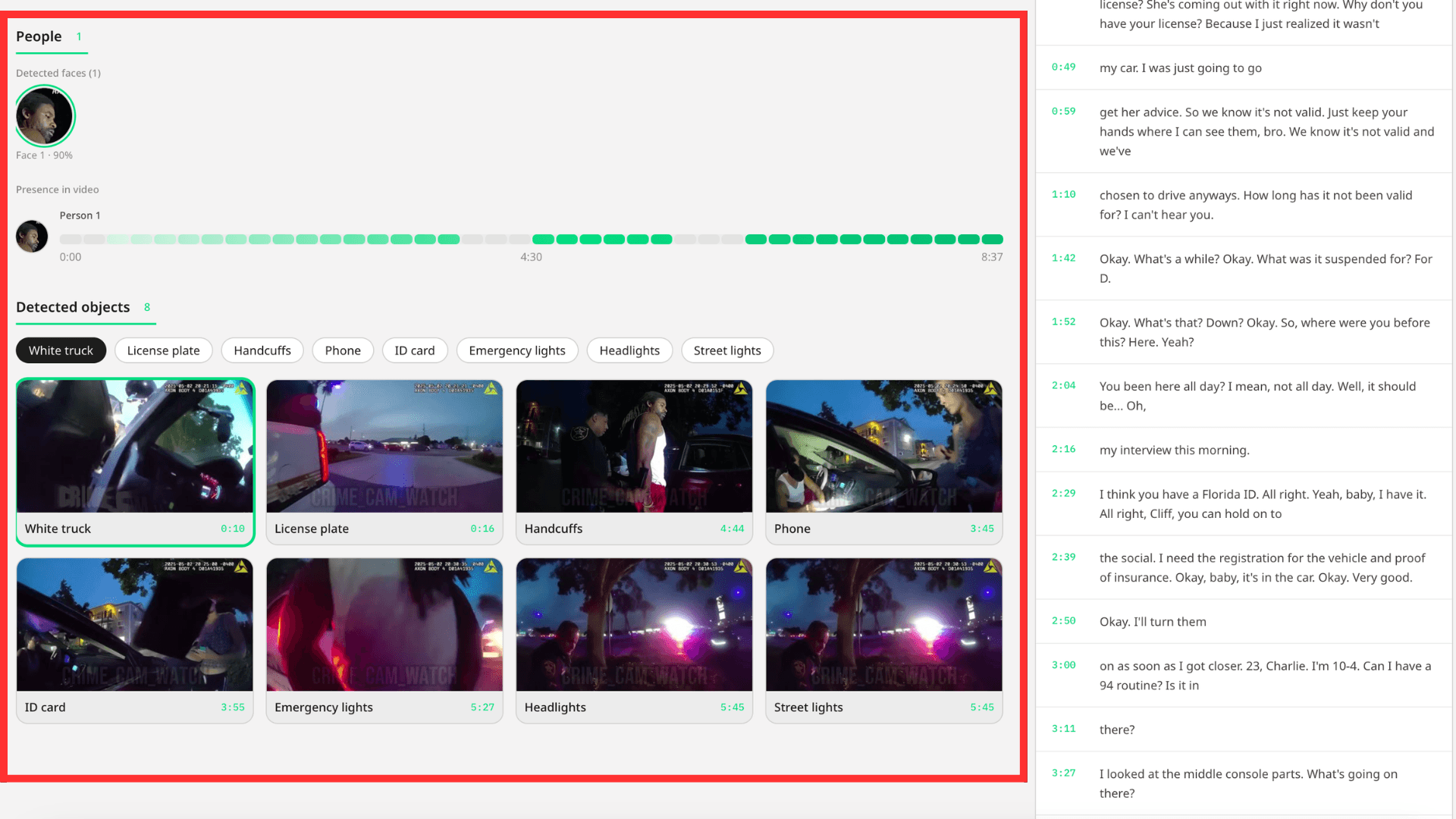 Beyond basic transcription, the platform identifies detected objects and useful face keyframes with precise timestamps (the specific moments where faces appear clearly):