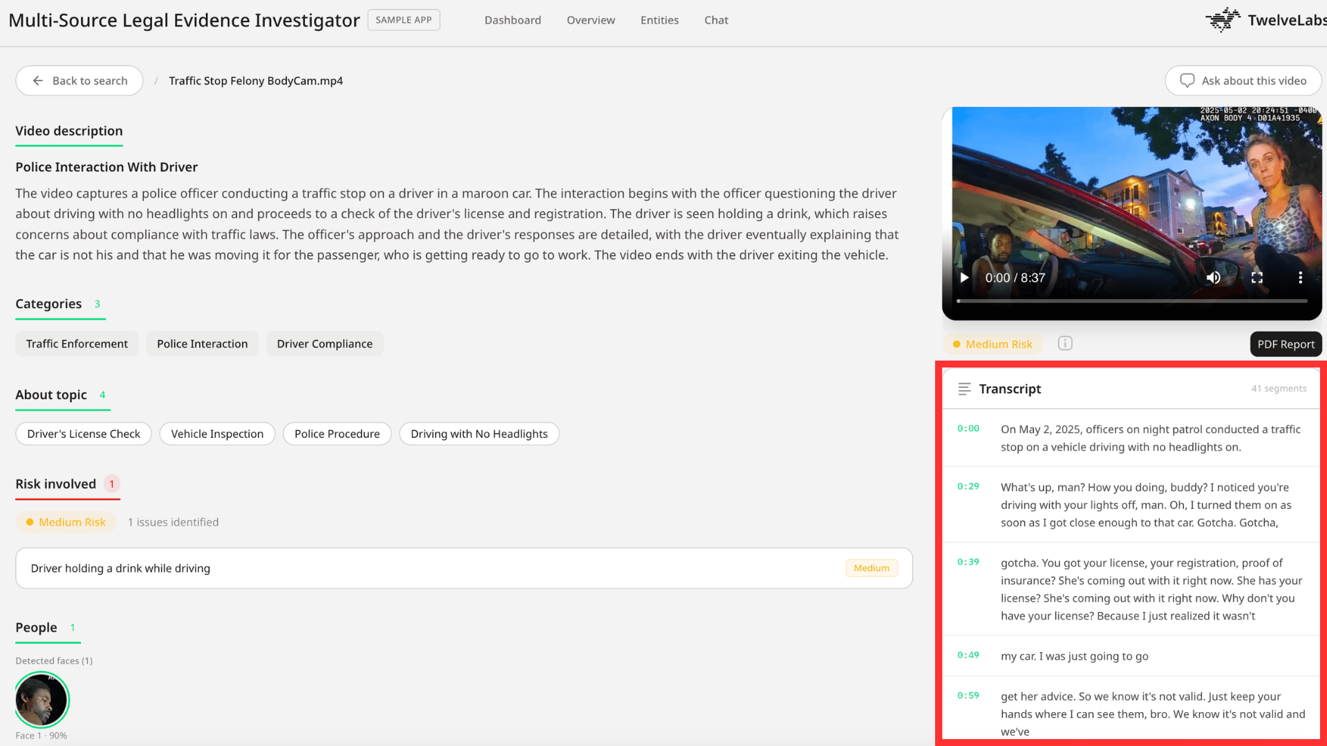 The traditional approach (manual review, basic metadata tagging, frame-by-frame analysis) doesn't scale. Legal teams need to search across disparate sources simultaneously, reconstruct timelines from fragmented footage, and identify critical moments without watching every second of video.