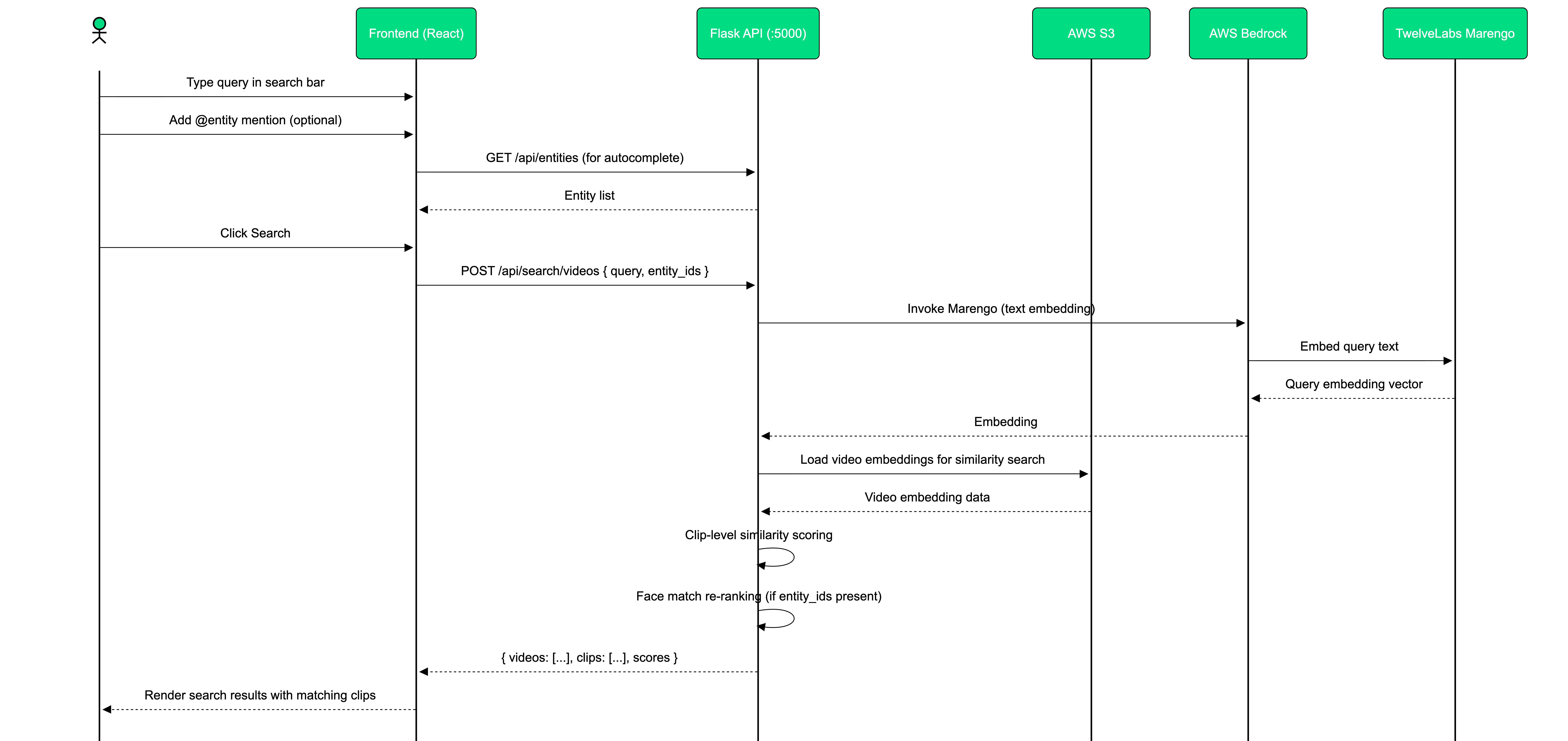 The scoring difference: Entity searches use visual_only=True and higher match thresholds because face matching requires stronger visual similarity than general content search. Text queries can match via audio transcription or visual content (either modality counts). Entity queries must match visually.