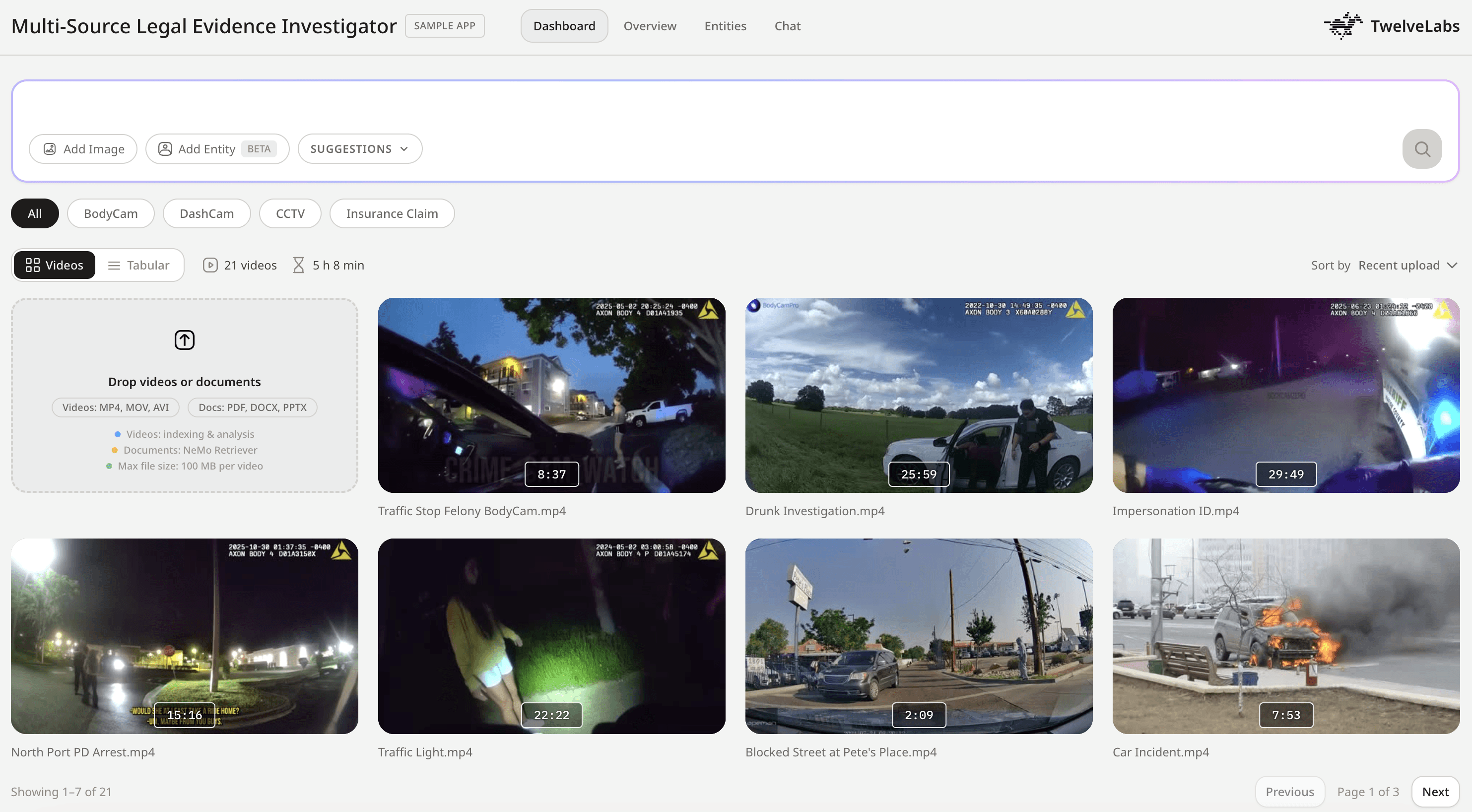 For legal tech ISVs building evidence management platforms, this architecture provides a reference implementation showing how TwelveLabs integrates into existing workflows without requiring wholesale platform rewrites. The single-index multi-source pattern, hybrid video+document retrieval, and structured analysis capabilities translate directly to production legal tech products.