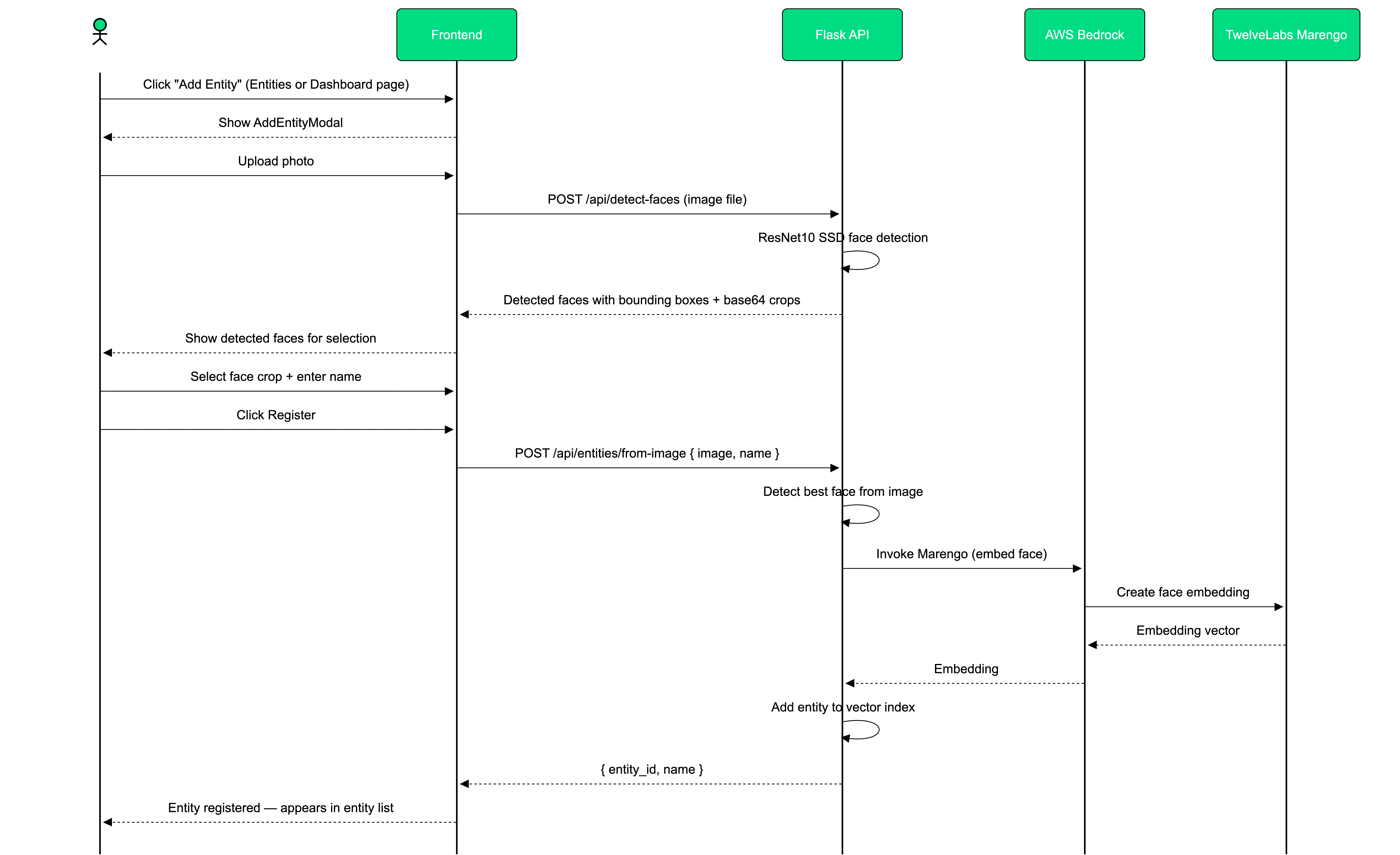 Legal investigations often require tracking specific individuals across multiple camera sources. The entity system enables this by converting face images into searchable embeddings: