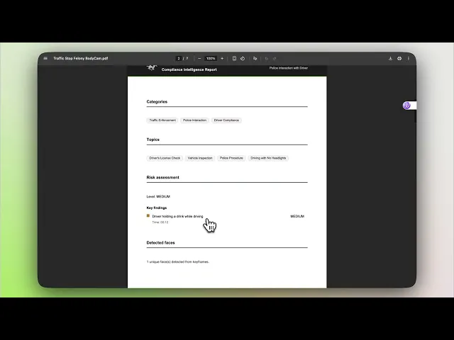 This demonstration shows how the platform handles real investigative workflows: searching across multiple video sources, identifying critical moments with precise timestamps, generating structured compliance analysis, and providing an interactive Q&A interface for deeper investigation.