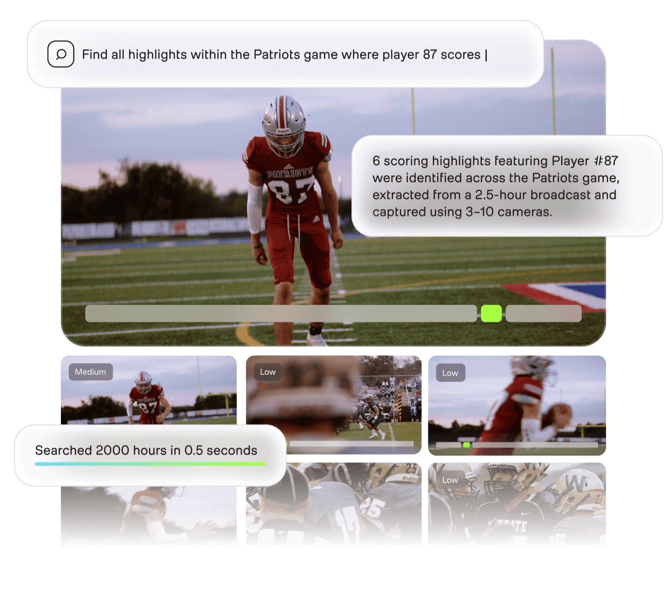 Quickly identify standout scenes or plays across hours of footage to create highlights and reels – without manual scrubbing.
