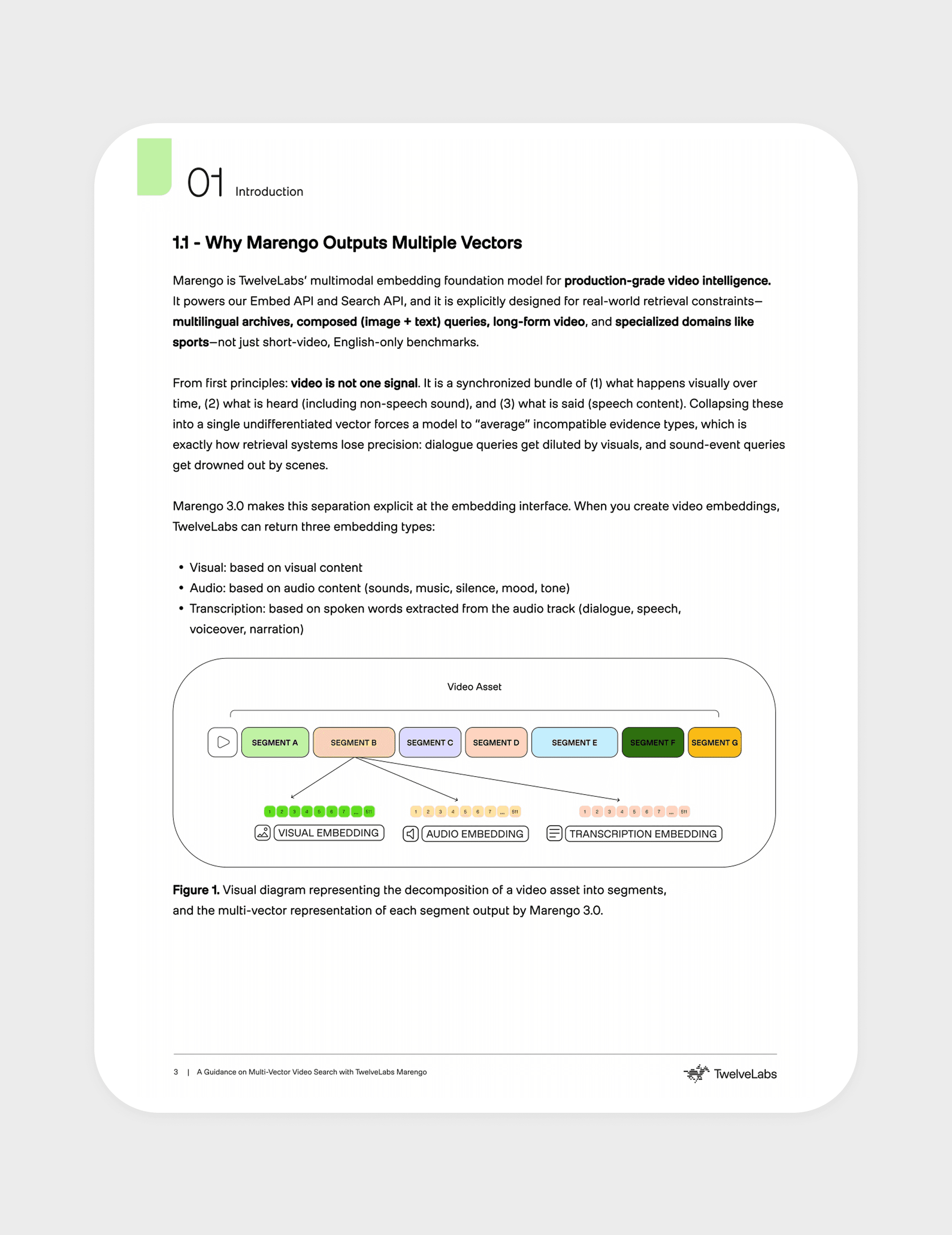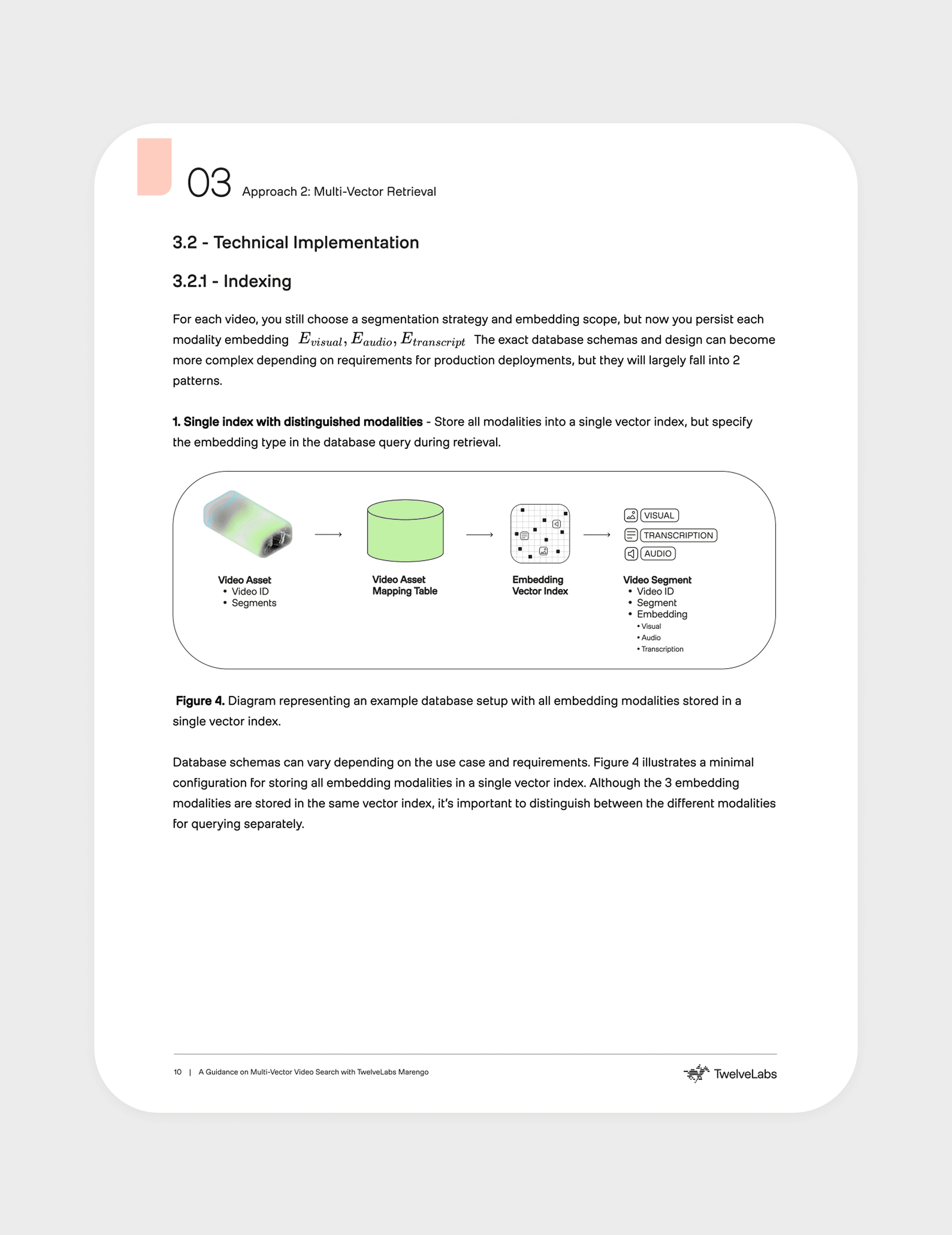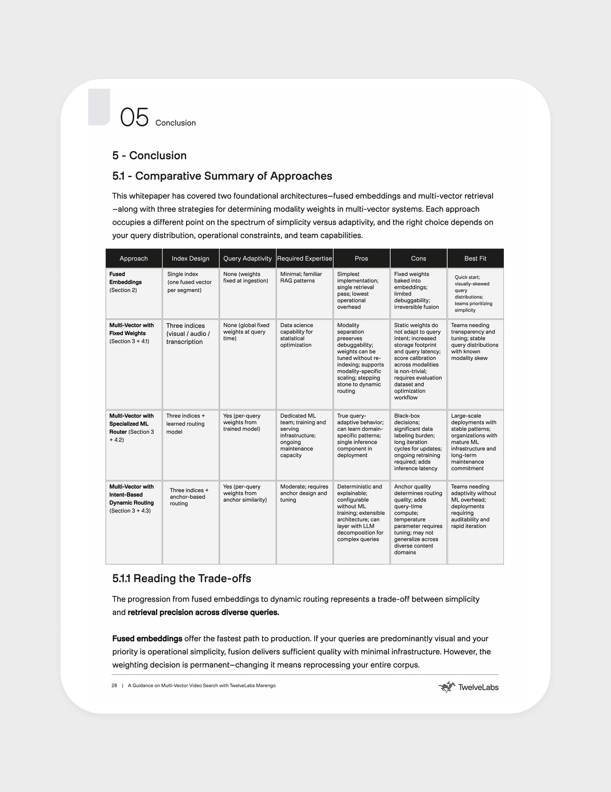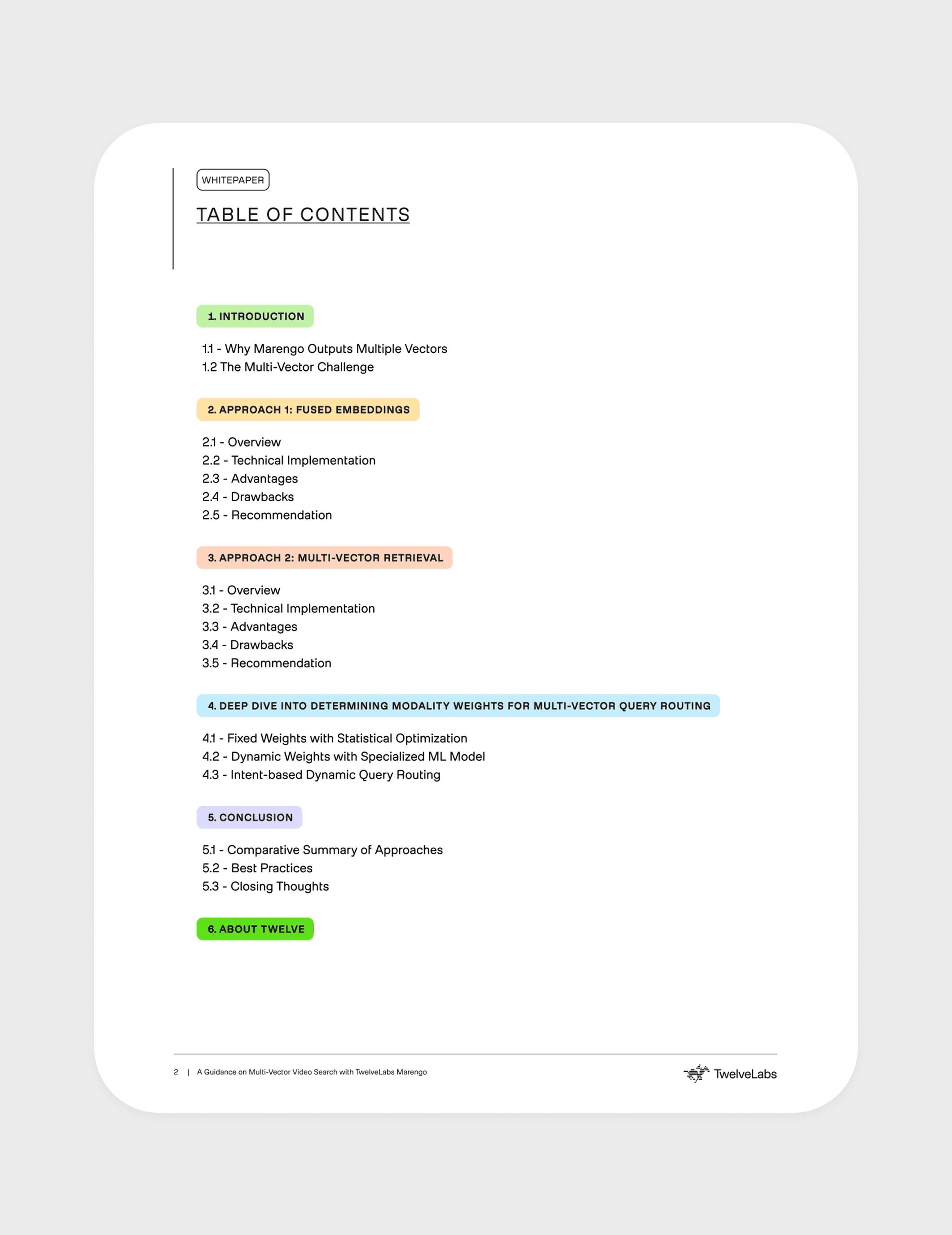 A technical deep dive into optimizing multi-vector query routing with Marengo. The paper compares two core approaches — fused embeddings vs. multi-vector retrieval — and explores three strategies for determining modality weights, helping developers choose the right architecture for their video AI search pipelines.