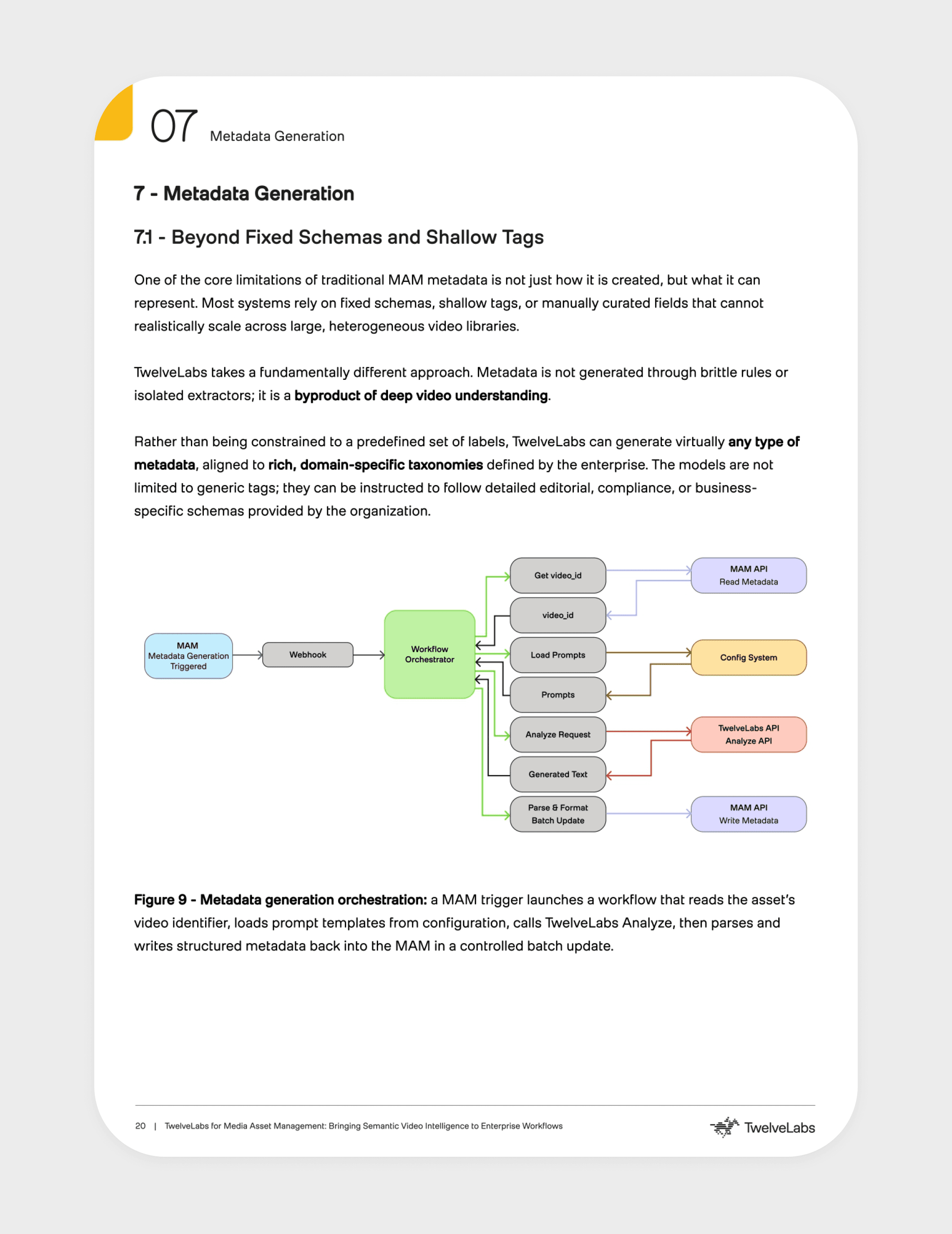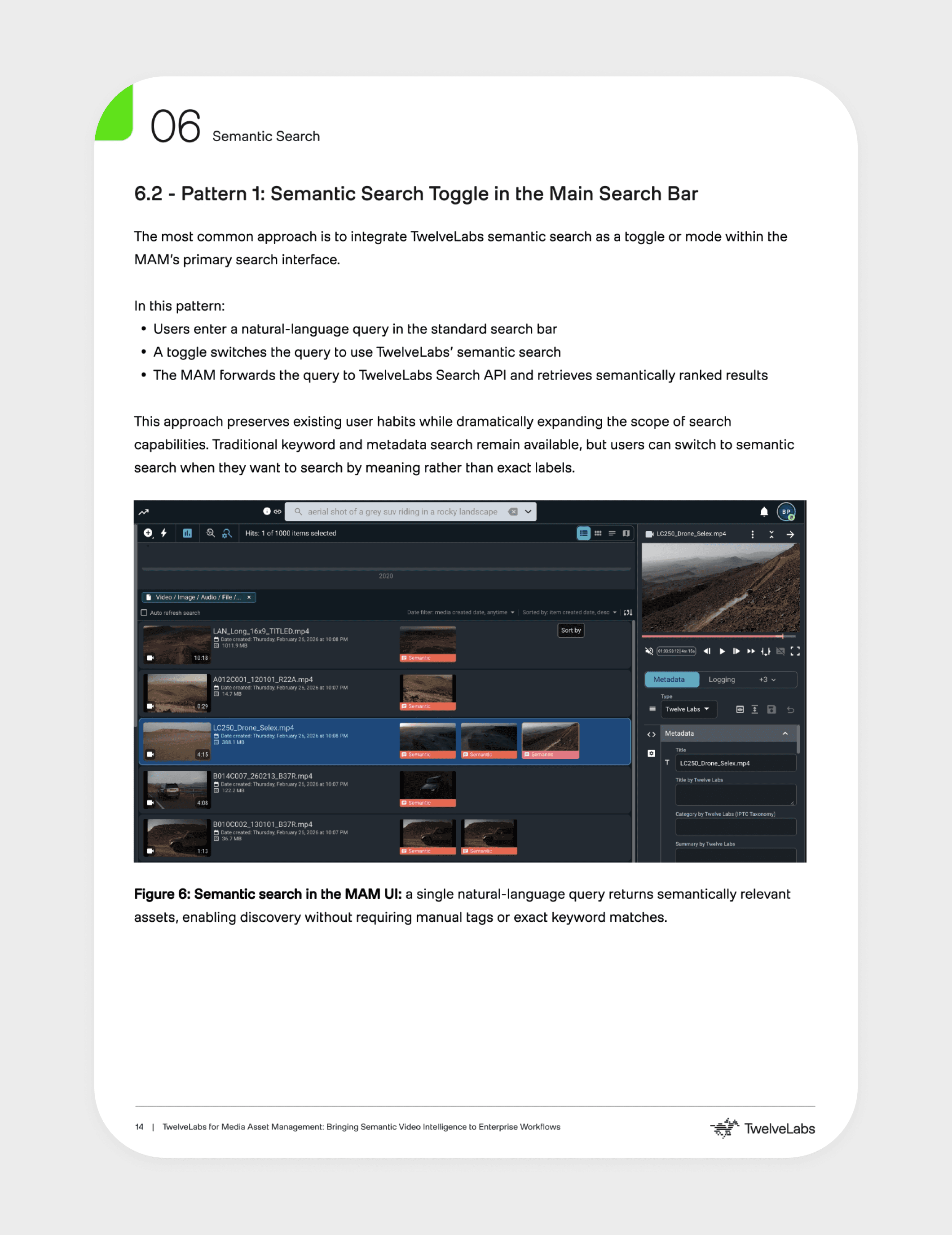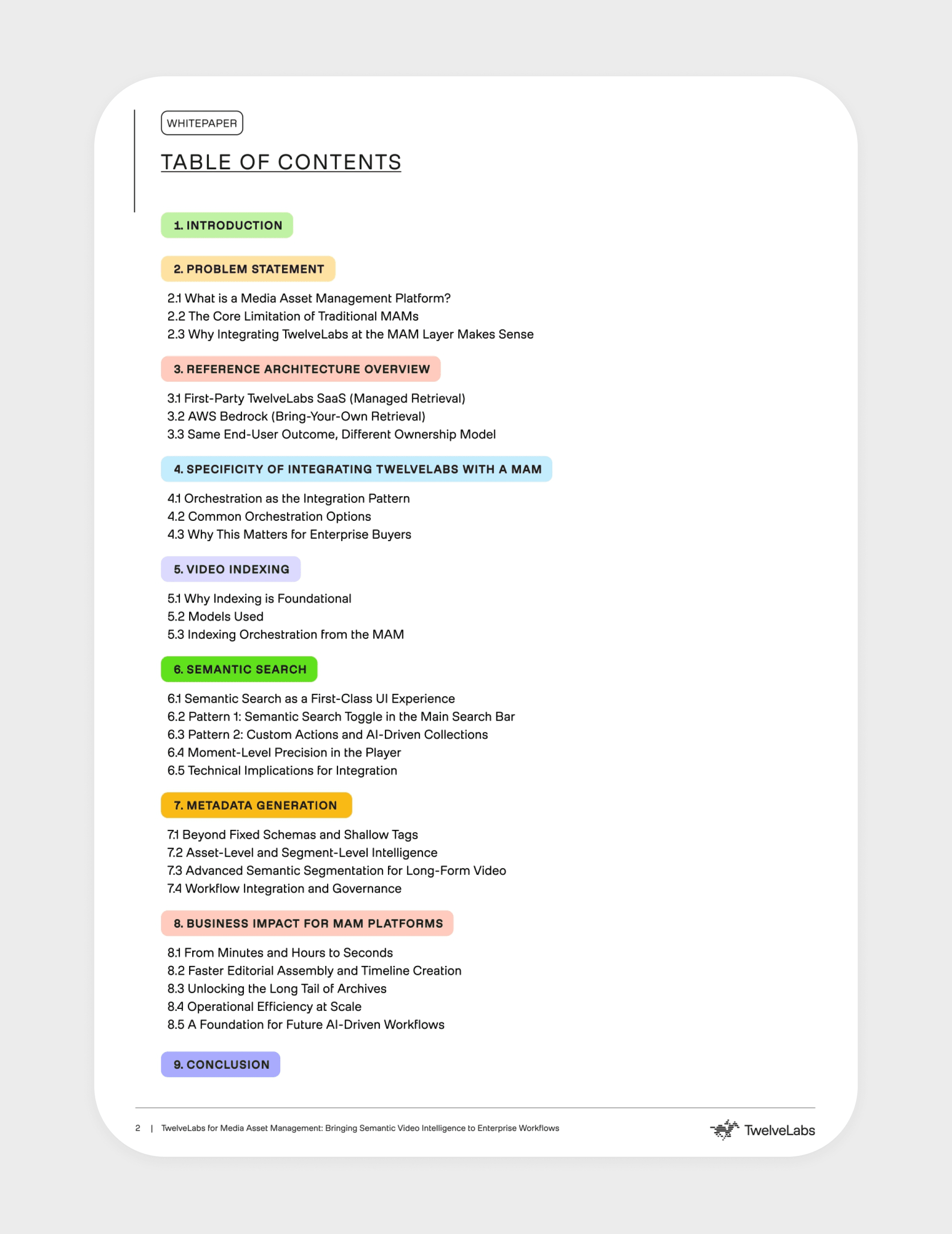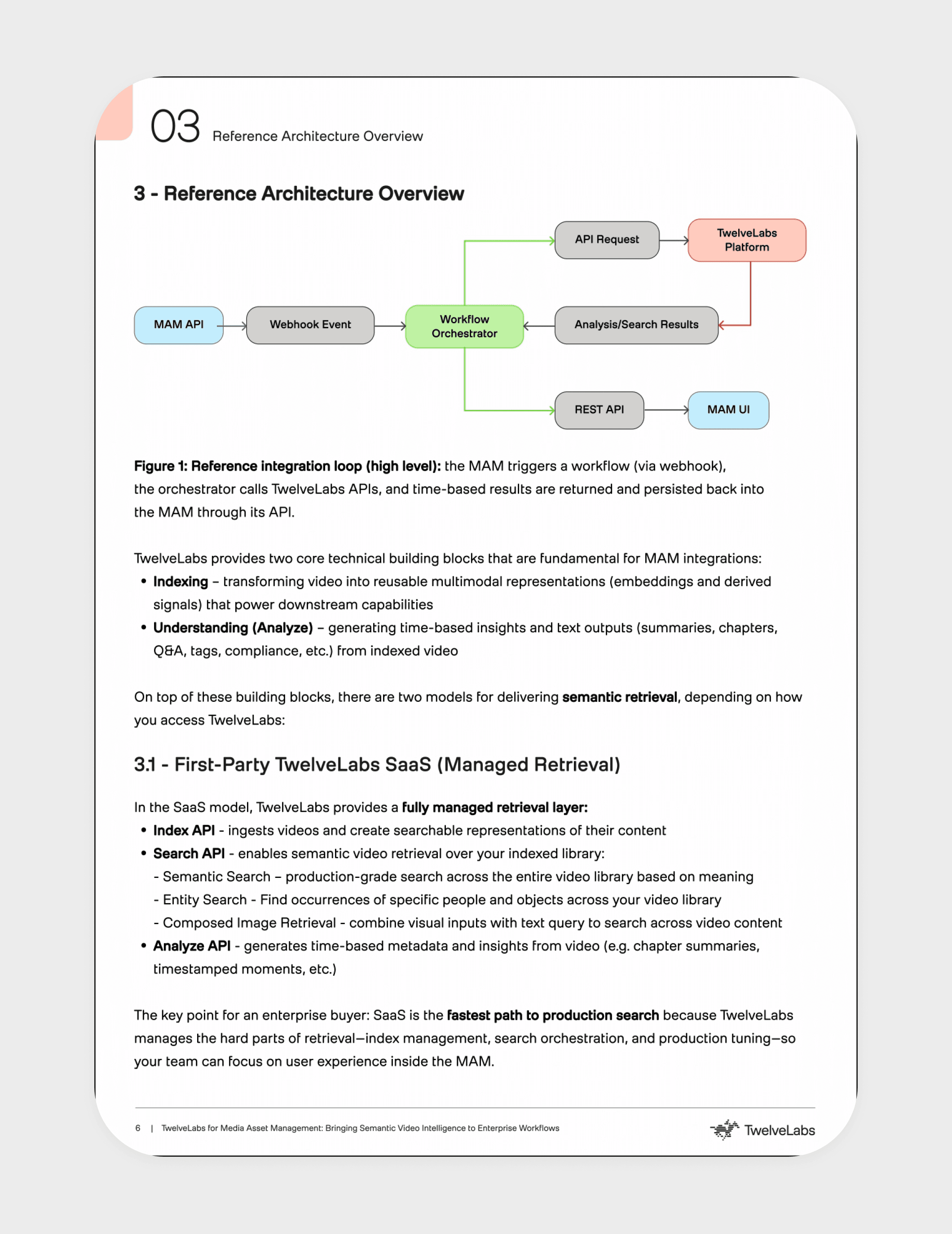 Media Asset Management platforms store and organize video content but lack the ability to understand what's actually happening inside those videos. This whitepaper explores how TwelveLabs addresses that gap by embedding AI-powered video intelligence directly into the MAM layer — enabling semantic search, automated metadata, and content understanding at scale — turning passive video archives into systems that can interpret meaning, intent, and context.